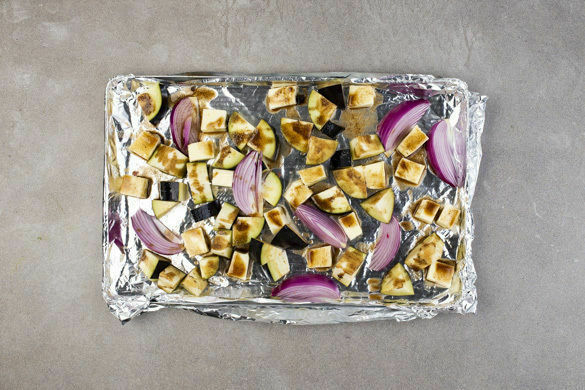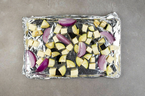 Den Backofen mit Grillfunktion auf 220°C oder mit Ober-/Unterhitze auf 250°C vorheizen. Ein Backblech mit Alufolie auslegen. Den Paneer und die Auberginen in 1–2cm große Würfel schneiden. Die Zwiebeln schälen, halbieren und die Hälften in je 4 Spalten schneiden. Den Käse und das Gemüse auf das vorbereitete Backblech geben.