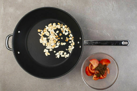 Die Mandeln in einer großen Pfanne ohne Zugabe von Fett bei mittlerer Hitze 1–2Min. goldbraun anrösten. Vorsicht, sie können schnell verbrennen. 1TL der Mandeln für die Garnitur beiseitelegen. Die Tomaten in Spalten schneiden und mit ca. 2/3 der Currypaste vermengen.