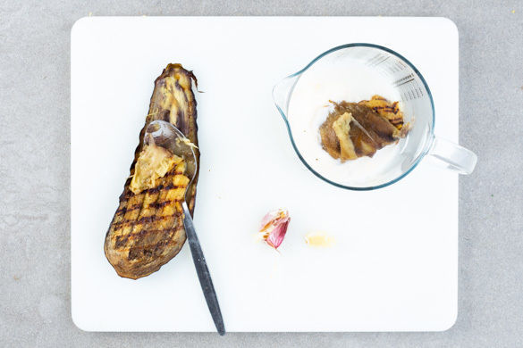 Die äußeren Auberginenscheiben aus dem Ofen nehmen und das weiche Auberginenfleisch mit einem Löffel aus der Schale lösen. Die Knoblauchschale entfernen und den Knoblauch mit dem Auberginenfleisch, 2EL Mayonnaise und 3–4EL Wasser in einem hohen Gefäß cremig pürieren. Den Dip mit Salz und Pfeffer abschmecken.