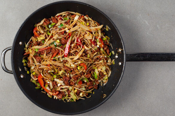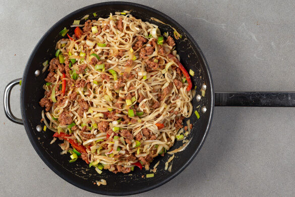 Nach einem langen Tag kann so ein blitzschnell und einfach zubereitetes Abendessen vieles wieder gutmachen, was tagsüber schiefgelaufen sein mag. Dafür garantieren wir bei diesem nicht zu unterschätzenden Veggie-Lieblingsgericht, das mit einer Handvoll Zutaten auskommt und innerhalb von 20 Minuten auf dem Tisch steht! Lecker gebratene Nudeln mit Gemüse, Tahini, Teriyakisauce und vegetarischem Hack – wer kann da Nein sagen?