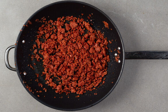 Das Veggie-Hack in einer großen Pfanne mit 1EL Pflanzenöl bei mittlerer bis starker Hitze 5–7Min. unter häufigem Rühren krümelig anbraten.