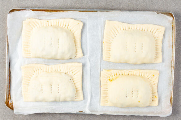 Den Teig mit dem Papier nach unten auf einem Blech ausrollen und in 4 Rechtecke schneiden. Die Füllung in gleichen Portionen jeweils auf einer Hälfte eines Rechtecks verteilen, dann die andere Hälfte darüberklappen. Die Ränder mit einer Gabel verschließen, dann die Empanadas an der Oberseite jeweils 3-mal einstechen, damit entstehender Dampf beim Backen entweichen kann.