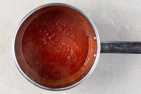 Währenddessen die restlichen passierten Tomaten in einem kleinen Topf mit je 1 Prise Salz, Pfeffer und Zucker verrühren. Den Knoblauch schälen, sehr fein würfeln oder durch eine Knoblauchpresse drücken und ebenfalls unterrühren. Die Tomatensauce einmal aufkochen, dann auf der niedrigsten Stufe ca. 10Min. zu einem dicklichen Dip einkochen lassen, dabei regelmäßig umrühren.