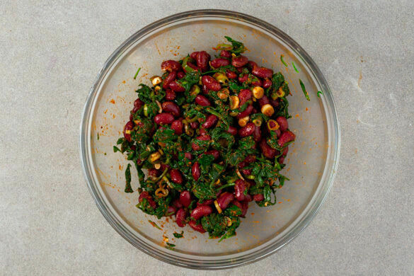 Die Bohnen in das Sieb abgießen und abtropfen lassen. Die Lauchzwiebeln in dünne Ringe schneiden. Den Spinat, die Bohnen und die Lauchzwiebeln mit 6EL passierten Tomaten, der Gewürzmischung und 1 kräftigen Prise Salz vermengen.