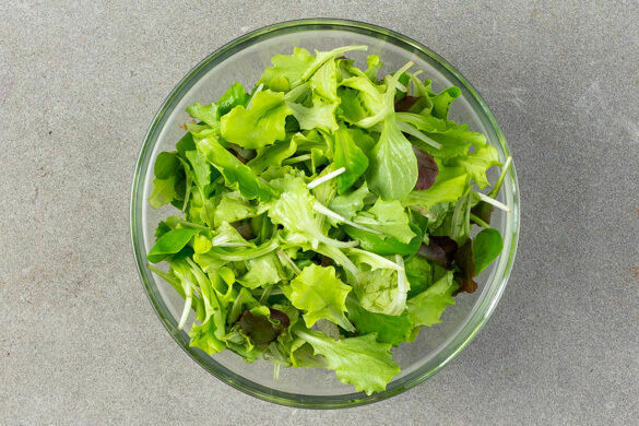 Den Salat kurz vor dem Servieren mit 1–2EL Olivenöl, 1–2EL Essig und je 1 Prise Salz und Pfeffer vermengen. Die Empanadas mit dem Salat anrichten und mit dem warmen Tomatendip servieren.