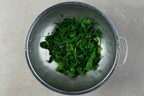 Den Backofen auf 200°C (180°C Umluft) vorheizen. In einem Wasserkocher ca. 1L Wasser zum Kochen bringen. Den Spinat in einem Sieb mit dem kochenden Wasser übergießen. Etwas abkühlen lassen, dann möglichst viel Flüssigkeit ausdrücken und den Spinat grob hacken.