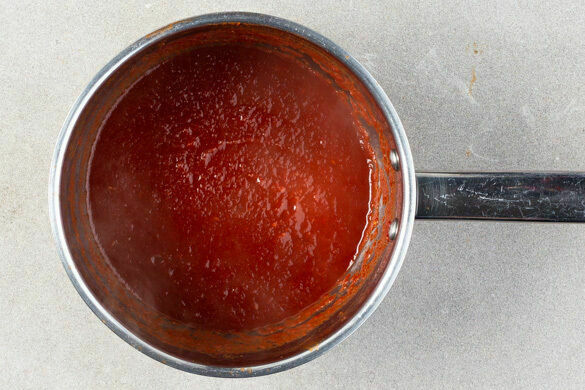 Währenddessen die restlichen passierten Tomaten in einem mittelgroßen Topf mit je 1 Prise Salz, Pfeffer und Zucker verrühren. Den Knoblauch schälen, sehr fein würfeln oder durch eine Knoblauchpresse drücken und ebenfalls unterrühren. Die Tomatensauce einmal aufkochen, dann auf der niedrigsten Stufe ca. 10Min. zu einem dicklichen Dip einkochen lassen, dabei regelmäßig umrühren.