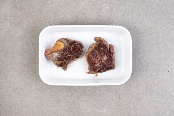 Das Fleisch trocken tupfen und in einer großen Pfanne mit 2EL Olivenöl bei starker Hitze auf jeder Seite ca. 1Min. scharf anbraten. Anschließend in eine Auflaufform geben, mit Salz und Pfeffer würzen und im Ofen 6–8Min. garen, bis das Fleisch durch, in der Mitte aber noch leicht rosa ist. Die Pfanne aufbewahren.