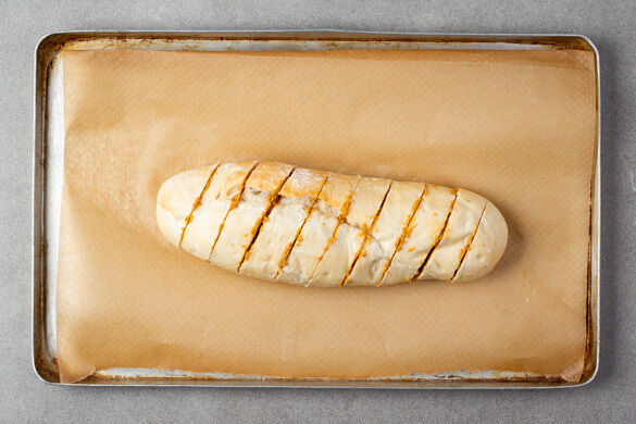Den Knoblauch schälen und sehr fein würfeln oder durch eine Knoblauchpresse drücken. Mit 1EL Butter, 1TL Tikka-Masala-Paste und je 1 kräftigen Prise Salz und Pfeffer vermengen. 1 Brötchen diagonal alle ca. 2cm tief einschneiden, die Knoblauchbutter in die Einschnitte streichen und das Brötchen auf einem mit Backpapier ausgelegten Backblech 5–8Min. goldbraun aufbacken.