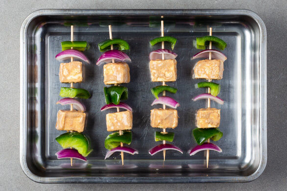 Die Paprikastücke, die Zwiebeln und den Paneer abwechselnd und nicht zu dicht auf die Holzspieße ziehen und diese in eine ausreichend große, leicht geölte Auflaufform legen. Die Spieße 10–15Min. im Ofen backen.