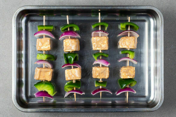 Die Paprikastücke, die Zwiebeln und den Paneer abwechselnd und nicht zu dicht auf die Holzspieße ziehen und diese in eine ausreichend große, leicht geölte Auflaufform legen. Die Spieße 10–15Min. im Ofen backen.