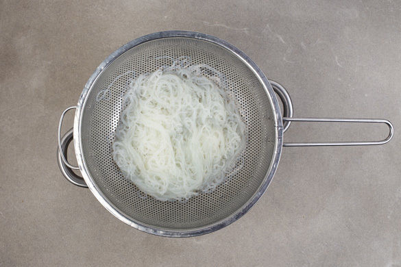 Sobald das Wasser kocht, den Topf vom Herd nehmen, die Nudeln in das heiße Wasser geben und 3–5Min. ziehen lassen, bis sie gar sind. In ein Sieb abgießen und kalt abspülen. Die abgekühlten Nudeln mit der 1/2 des Dressings vermengen.