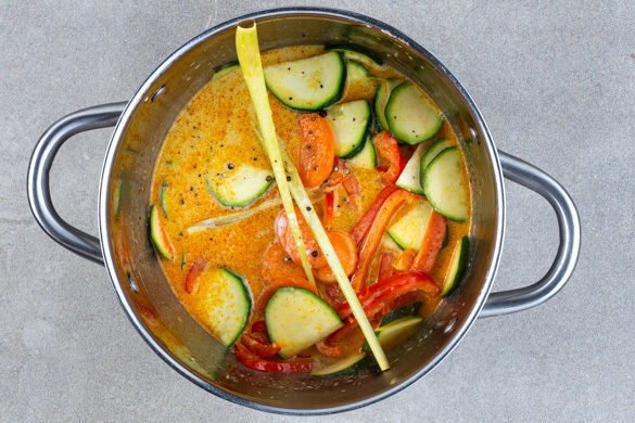 Ca. 1/3 der Currypaste unter das Gemüse rühren, dann mit der Kokosmilch und 50ml Wasser ablöschen. Das Curry 5–8Min. bei niedriger Hitze sanft köcheln lassen. Nach Geschmack mit mehr Currypaste sowie Salz und Pfeffer würzen. Das Zitronengras entfernen.