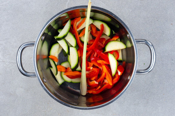 Die restlichen Karotten, die Paprika, die Zucchini und das Zitronengras in einem mittelgroßen Topf mit 1EL Pflanzenöl bei starker Hitze 1–2Min. anbraten.