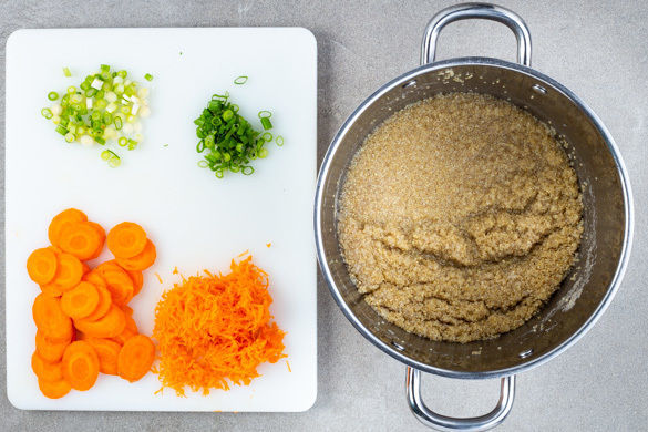 Den Backofen auf 220°C (200°C Umluft) vorheizen. Die Quinoa in einem Sieb abspülen. In einem kleinen Topf in 450ml kochendem, leicht gesalzenem Wasser abgedeckt 10–12Min. bei niedriger Hitze garen. Die Karotte ggf. schälen. Die Hälfte fein reiben, den Rest in Scheiben schneiden. Den grünen und weißen Teil der Lauchzwiebel separat in Ringe schneiden.