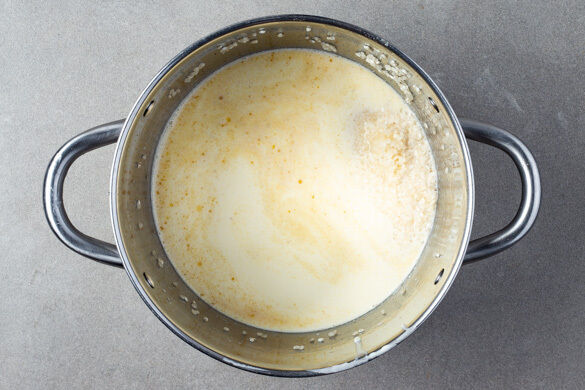 Den Reis mit 700ml heißem Leitungswasser und der Sahne ablöschen, dann den Vanillezucker, 2EL Zucker und 2 weiteren Prisen Salz unterrühren und die Flüssigkeit zum Kochen bringen. Den Reis bei mittlerer bis niedriger Hitze ca. 15Min. sanft köcheln lassen, dabei regelmäßig umrühren, damit der Reis nicht anbrennt.