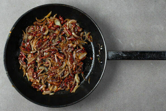 Den Bacon in derselben Pfanne bei mittlerer Hitze ca. 2Min. anbraten, bis er leicht knusprig ist. Dann die Zwiebeln dazugeben und weitere 3–4Min. braten, bis sie leicht gebräunt sind. Die Sauce einrühren und mit Salz und Pfeffer abschmecken. Die Pfanne vom Herd nehmen.