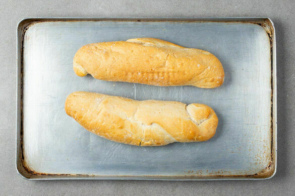 Die Brötchen auf einem mit Backpapier ausgelegten Backblech 6–8Min. im Ofen aufbacken, bis sie leicht gebräunt und knusprig sind.