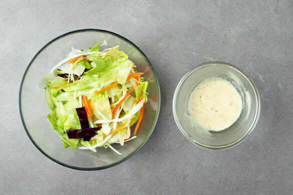 Je 2–3EL Olivenöl und Essig mit 3–4EL Mayonnaise verrühren und das Dressing mit Salz, Pfeffer und Zucker abschmecken. Den Salat mit dem Dressing vermengen und mit den Hähnchenbaguettes servieren.