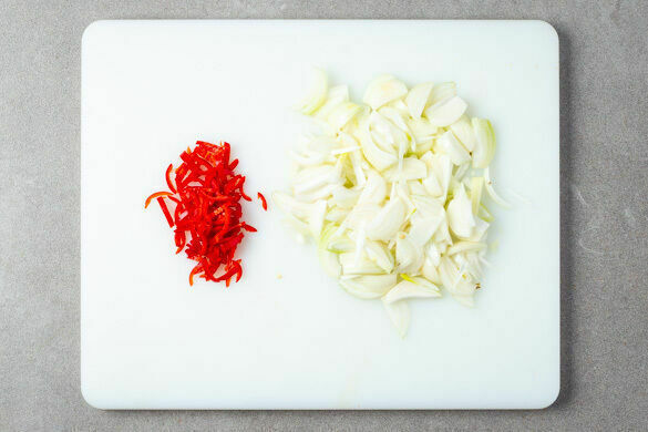 Den Backofen auf 220°C (200°C Umluft) vorheizen. Die Zwiebeln schälen, halbieren und in feine Streifen schneiden. Die Chilischote längs halbieren und in hauchdünne Streifen schneiden. Tipp: Für weniger Schärfe die Kerne entfernen.
