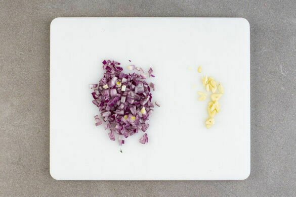Die Zwiebel schälen, halbieren und in feine Würfel schneiden. Den Knoblauch schälen und ebenfalls fein würfeln.