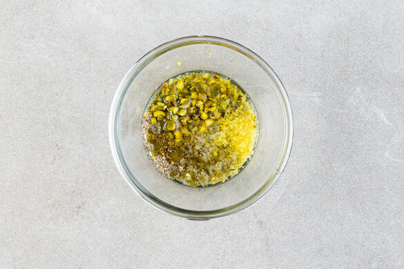 Die Kapern und die Pistazien grob hacken und mit 3EL Olivenöl, 1EL Wasser, 2EL Zitronensaft, dem Zitronenabrieb, 1/2TL Salz und 1 Prise Pfeffer zu einem Dressing verrühren.