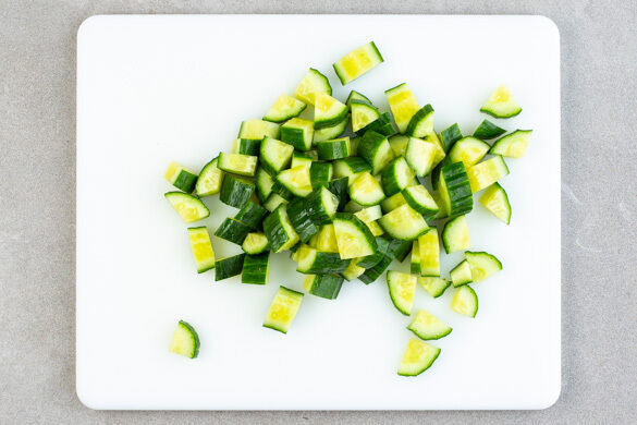 Die Gurke der Länge nach vierteln und in kleine Stücke schneiden.
