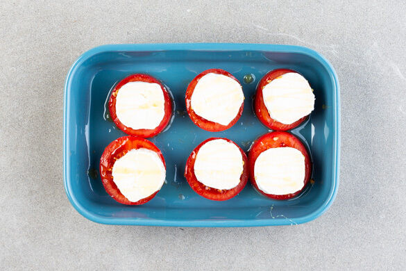 Die Tomaten in eine Auflaufform legen, mit je 1 Käsescheibe belegen und mit etwas Honig beträufeln oder mit 1 Prise Zucker bestreuen. Mit insgesamt 1TL Olivenöl beträufeln und die Tomaten im heißen Ofen auf einer der oberen Schienen 13–15Min. backen, bis der Käse leicht golden ist und die Tomaten weich sind.