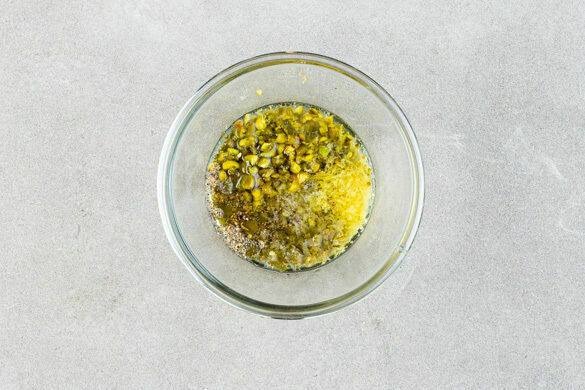 Die Kapern und die Pistazien grob hacken und mit 5–6EL Olivenöl, 2EL Wasser, dem Zitronensaft, dem Zitronenabrieb, 1/2–1TL Salz und 1 kräftigen Prise Pfeffer zu einem Dressing verrühren.