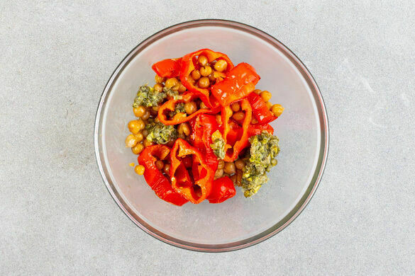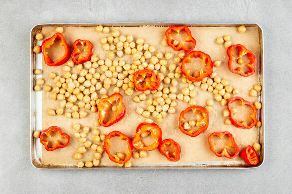 Inzwischen den Strunk der Paprika herausschneiden, dann die Paprika entkernen und in breite Ringe schneiden. Die Kichererbsen in einem Sieb kalt abspülen und abtropfen lassen. Mit den Paprikaringen auf einem mit Backpapier ausgelegten Backblech verteilen und 8–10Min. im Ofen auf einer der unteren Schienen rösten.