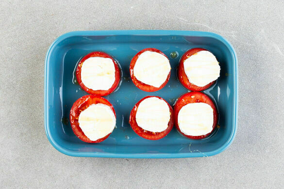 Die Tomaten in eine Auflaufform legen, mit je 1 Käsescheibe belegen und mit etwas Honig beträufeln oder mit 1 Prise Zucker bestreuen. Mit insgesamt 2TL Olivenöl beträufeln und die Tomaten im heißen Ofen auf einer der oberen Schienen 13–15Min. backen, bis der Käse leicht golden ist und die Tomaten weich sind.