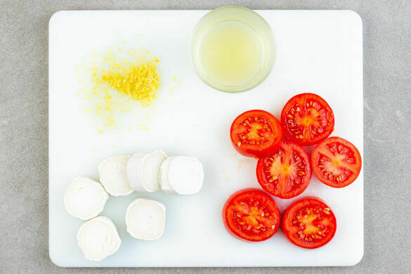 Den Backofen auf 210°C (190°C Umluft) vorheizen. Die Tomaten jeweils in 2 gleich dicke Scheiben schneiden, den Strunk entfernen. Den Ziegenkäse jeweils in 6 gleich dicke Scheiben schneiden. Die Zitronenschale abreiben, dann die Zitrone halbieren und auspressen.