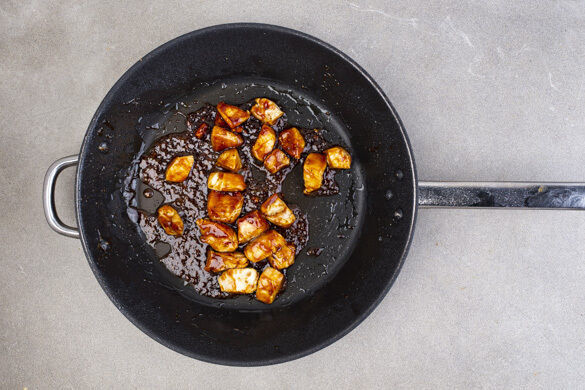 Das Fleisch trocken tupfen und in einer großen Pfanne mit 1–2EL Pflanzenöl sowie 1 Prise Salz und Pfeffer bei mittlerer Hitze 2–3Min. rundum goldbraun anbraten. 2EL Hoisinsauce unterrühren und weitere ca. 2Min. braten. Das Fleisch auf einem Teller beiseitestellen, die Pfanne auswischen.