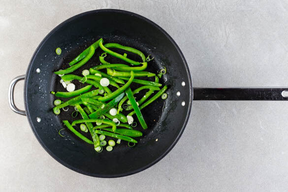 Die Paprika halbieren, entkernen und in dünne Streifen schneiden. Die Lauchzwiebel in feine Ringe schneiden, dabei den grünen und weißen Teil voneinander trennen. Die Paprika und die weißen Lauchzwiebelringe in der Pfanne mit 1EL Pflanzenöl und 1 Prise Salz bei mittlerer Hitze 3–4Min. anbraten.