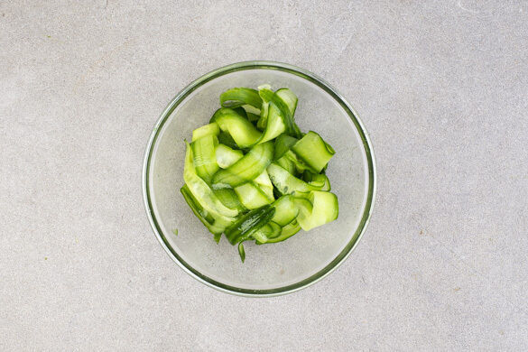 In einem großen Topf ausreichend leicht gesalzenes Wasser für die Nudeln zum Kochen bringen. Die Gurke mit einem Sparschäler in breite Streifen schneiden. Die Gurkenstreifen mit 1–2EL Essig, 1–2TL Zucker und 1 Prise Salz vermengen und beiseitestellen.