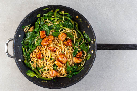 Ein asiatisches Pfannengericht wie aus dem Bilderbuch: schnell in der Zubereitung und verdammt lecker! Die köstlich-klebrige Glasur, dir das zarte Hähnchenfleisch überzieht, ist dank Hoisinsauce und aromatischer Chilisauce herrlich würzig. Dazu die Nudelpfanne mit Paprika und Spinat sowie ein erfrischender Gurkensalat – perfekt!