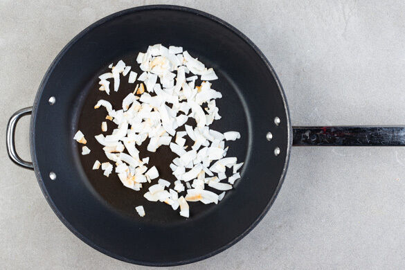 In einem mittelgroßen Topf ausreichend gesalzenes Wasser für 2/3 der Nudeln zum Kochen bringen. Die Kokosflocken in einer großen Pfanne ohne Zugabe von Fett bei mittlerer Hitze 1–2Min. goldbraun anrösten. Zum Abkühlen aus der Pfanne nehmen, die Pfanne aufbewahren.