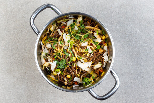 Südostasien satt im Eiltempo? Das haben wir heute für dich! Es gibt eine herzhafte Sobanudelpfanne mit buntem Gemüse und gerösteten Kokosflocken, fein-exotisch gewürzt mit süßlichem Ketjap Manis und fruchtig-herber Limette sowie Thai-Basilikum und Koriander. Auf diesen Berg aus Köstlichkeiten platzierst du einen der Wohlfühlklassiker schlechthin: ein Spiegelei. Noch ein wenig Sriracha-Sauce darübergeträufelt ... Zu Tisch!