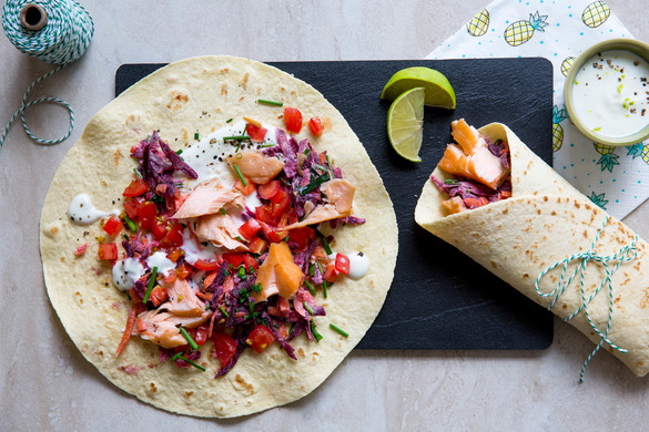 Gefüllte Tortillas sind in unserer Testküche ein echter Abräumer! Hier werden die weichen Weizenfladen nach Lust und Laune mit fruchtig-frischer Limettensauce bestrichen und mit saftigem Räucherlachs, Tomaten und knackigem Karottensalat belegt. Das geht alles auch noch ganz fix. „Good Mood Food“ vom Feinsten!