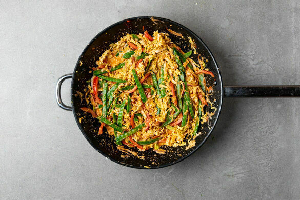Die Kaiserschoten, die Paprika und die Zwiebeln in einer großen Pfanne oder einem Wok mit 1EL Pflanzenöl bei starker Hitze 1–2Min. anbraten. Ca. 2/3 der Currypaste oder mehr unterrühren und ca. 1Min. mitbraten, dann mit der Kokosmilch und 100ml Wasser ablöschen. Das Gemüse noch 1Min. in der Kokosmilch garen, dann mit Salz und Pfeffer abschmecken.