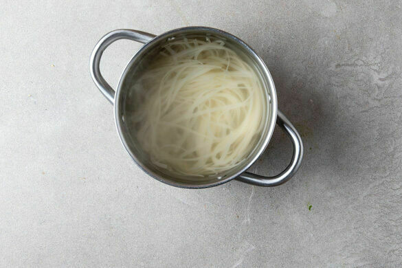 3/4 der Nudeln in das kochende Wasser geben und 1–2Min. vorkochen, sie sollen noch nicht ganz durchgaren. In ein Sieb abgießen und kalt abschrecken. Tipp: Wer großen Hunger hat, kann alle Nudeln verwenden.