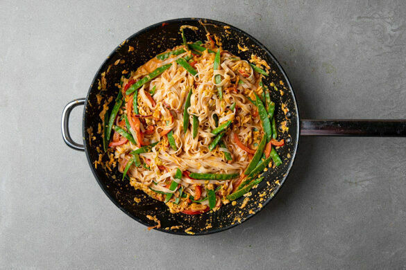 Die Nudeln zum Gemüse in die Pfanne geben, alles gut vermengen und einige Minuten erwärmen, bis die Nudeln gar sind. Die Nudeln auf Teller verteilen, mit dem Tofu-Erdnuss-Crumble garnieren und mit den Zitronenspalten servieren.