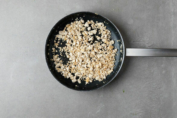 Den Tofu mit Küchenkrepp so gut wie möglich auspressen, dann zerbröseln und in einer großen Pfanne mit 2EL Pflanzenöl bei starker Hitze ca. 5Min. unter regelmäßigem Rühren anbraten, bis der Tofu sehr trocken erscheint.