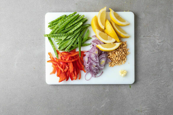 In einem großen Topf ausreichend gesalzenes Wasser für die Nudeln zum Kochen bringen. Die Kaiserschoten längs halbieren. Die Paprika vierteln, entkernen und in dünne Streifen schneiden. Die Zwiebel schälen, halbieren und in feine Streifen schneiden. Den Knoblauch schälen und fein würfeln. Die Zitrone in Spalten schneiden. Die Erdnüsse grob hacken.