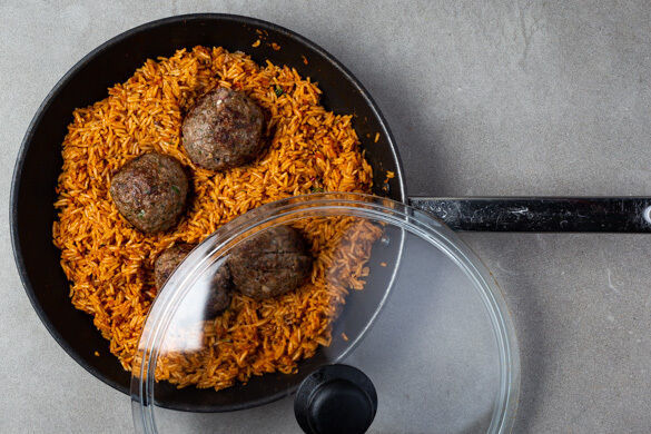 Ist die Sehnsucht groß nach Griechenland? Jaaaaaa! Wir schaffen kulinarische Abhilfe: Es gibt Rinderhackbällchen mit cremiger Fetafüllung und den typischen Salat aus Gurke, Tomate und Zwiebel, aromatisiert mit frischem Dill. Dazu servierst du Reis, der raffiniert mit einem Pesto aus getrockneten Tomaten und Oliven fein gemacht wird. Sind wir jetzt alle glücklich? Jaaaaaa!