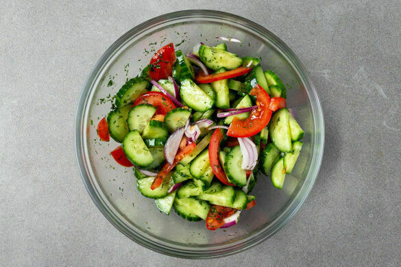 Die Gurke längs halbieren und in dünne Scheiben schneiden. Die Tomate halbieren und in dünne Spalten schneiden. Die Gurken und die Tomaten mit den Zwiebelstreifen, ca. 3/4 des restlichen Dills, 2EL Olivenöl und 2EL Essig vermengen und den Salat mit Salz und Zucker abschmecken.