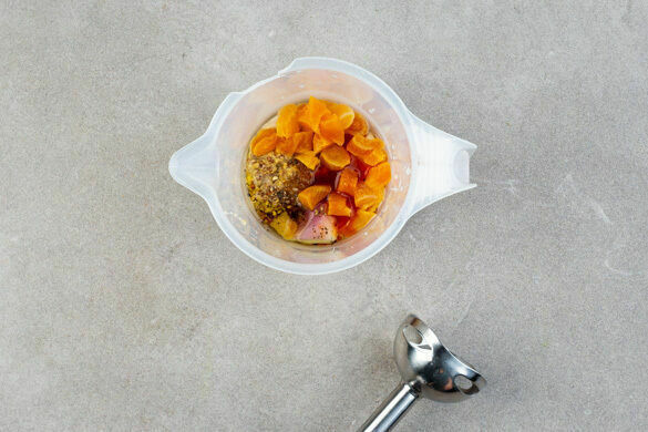 Die Aprikosen in ein Sieb abgießen und abtropfen lassen. Die Schalotte schälen, halbieren und grob würfeln. Die 1/2 der Aprikosen, den Senf, die Schalotten, 1–2TL Sweet-Chili-Sauce, 3EL Olivenöl, 3EL Essig und je 1 Prise Salz und Pfeffer in einem hohen Gefäß mit einem Stabmixer zu einem cremigen Dressing pürieren.