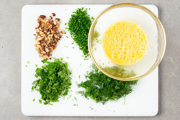 Die Mandeln grob hacken. Den Schnittlauch in kleine Ringe schneiden. Den Kerbel und den Dill ohne harte Stängel grob schneiden. In einer mittelgroßen Pfanne 1TL Butter schmelzen lassen. Die Eier mit einer Gabel oder einem Schneebesen verquirlen.