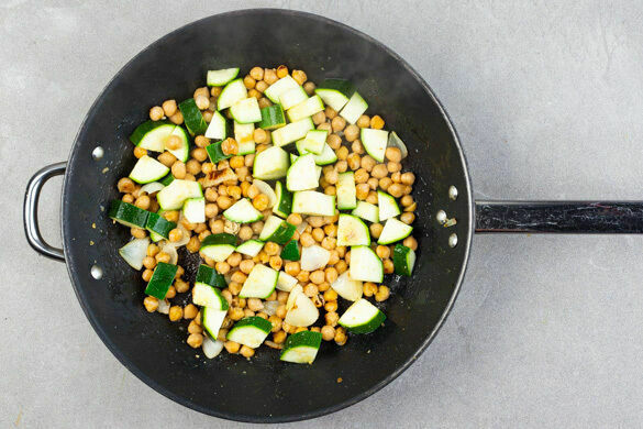 Die Zwiebeln und die Kichererbsen in einer großen Pfanne mit 2EL Olivenöl und 1 Prise Salz bei starker Hitze ca. 2Min. anbraten, bis die Zwiebeln langsam braun werden. Die Zucchini hinzugeben und alles vermengen.