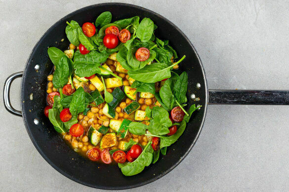 Obwohl die Tajine ursprünglich aus Nordafrika stammt, gibt es inzwischen mit zunehmend internationaler Kochkultur auch Tajine-Rezepte anderer Herkunft. Heute bleiben wir aber beim klassischen Ansatz und machen die Aromabombe mit proteinreichen Kichererbsen, Zucchini, Tomaten und Spinat. Safran und eine orientalische Gewürzmischung geben geschmackliche Tiefe, mit Petersilie abgerundeter Joghurt einen feinen Frischekick.